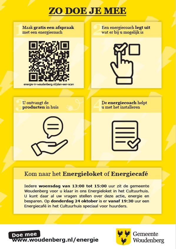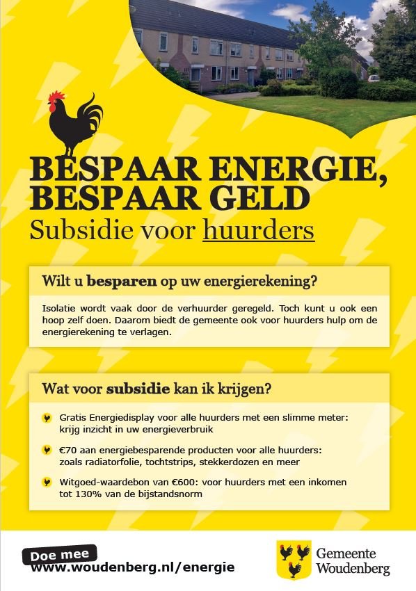 Veel huurders hebben een brief van ons gekregen. In deze brief vertellen we over een tijdelijke subsidie voor energiebesparende producten. Wil je meer weten over deze subsidie? Kijk op onze website: https://www.woudenberg.nl/duurzaamheid-en-energie/energie-voor-huurders, of neem contact met ons op via energie@woudenberg.nl.