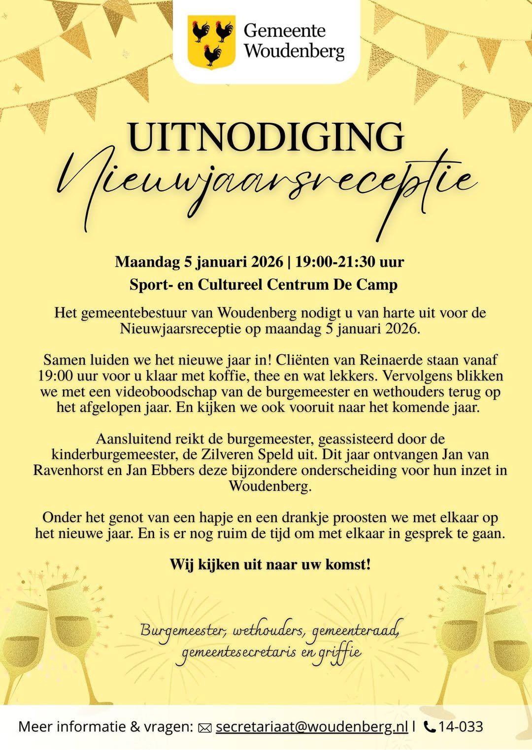 Op maandag 5 januari 2026 luiden we samen het nieuwe jaar in tijdens de Nieuwjaarsreceptie van de gemeente Woudenberg!